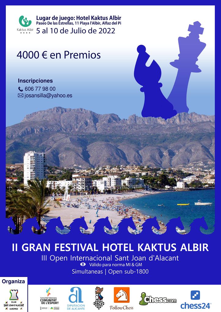 - Para quedar debidamente inscrito se tendrá que trasferir o ingresar el dinero en la cuenta de Caixa Popular: (Club de Ajedrez Sant Joan d’Alacant – IBAN ES49 3159 0071 3125 4640 9828 BIC: BCOEESMM159 , poner en concepto el nombre y apellidos del inscrito, luego mandar un email a josansilla@yahoo.es, con nombre, dos apellidos, código FIDE, fecha nacimiento, club y un teléfono de contacto.