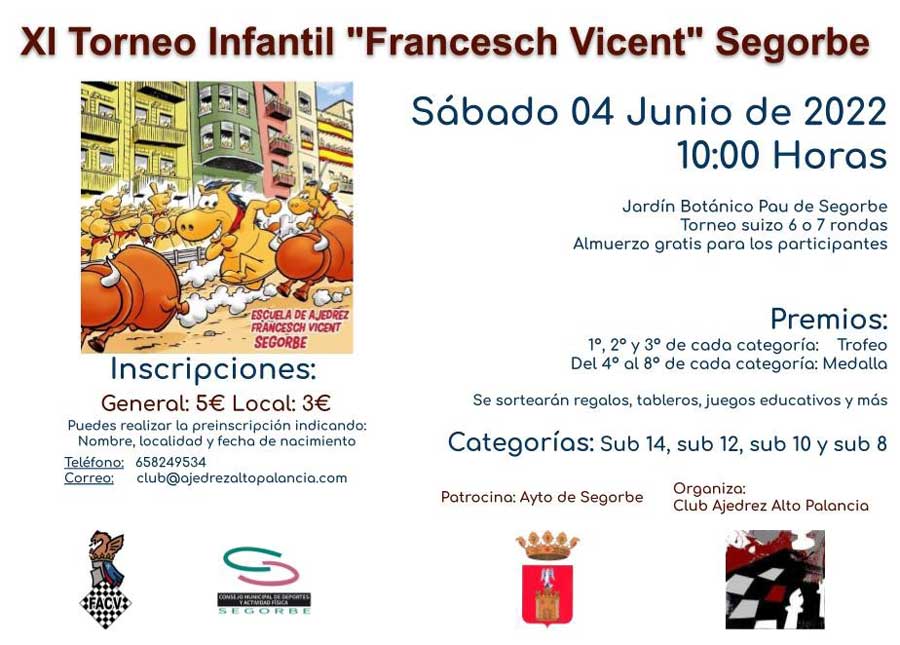 Preinscripciones: En el correo electrónico club@ajedrezaltopalancia.com o teléfono WhatsApp 658249534, indicando nombre, localidad y fecha de nacimiento y teléfono.