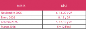 - Todos los jueves tardes a partir de las 18:30 h según tabla.